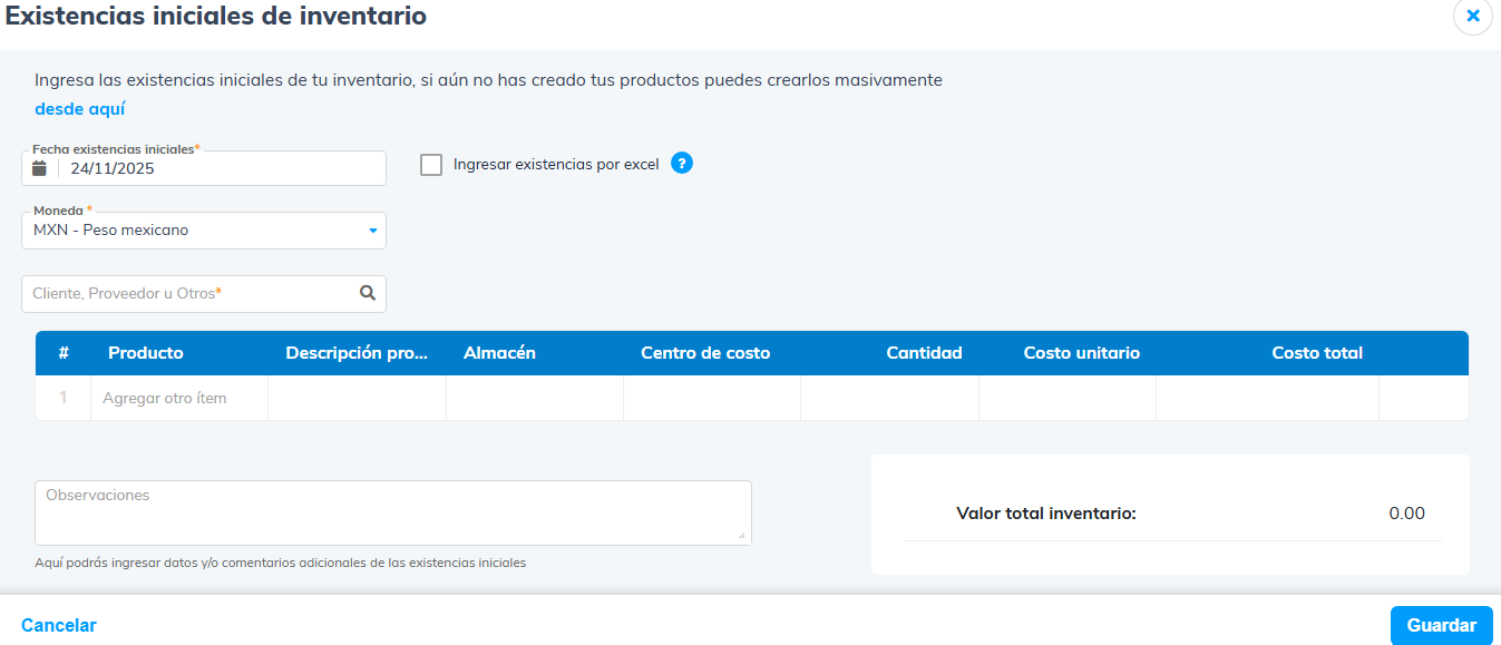 Productos y servicios → Documentos de productos / servicios → botón Importar → Subir saldos (Existencias) iniciales de inventarios.
